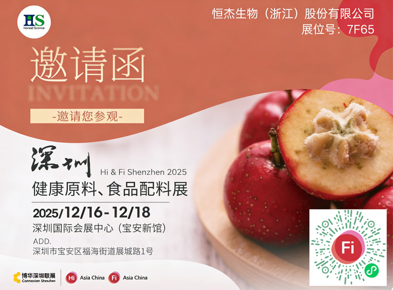 尊敬的合作伙伴与业界同仁: 恒杰生物(浙江)股份有限公司诚邀您莅临2025 深圳健康原料、食品配料展(Hi & Fi Shenzhen 2025)! 本次展会信息如下: 展会时间:2025 年 12 月 16 日 - 12 月 18 日 展会地点:深圳国际会展中心(宝安新馆)(深圳市宝安区福海街道展城路 1 号) 我司展位号:7F65 我们将在展位呈现公司核心健康原料与食品配料产品,期待与您现场交流合作、共探行业新机遇!